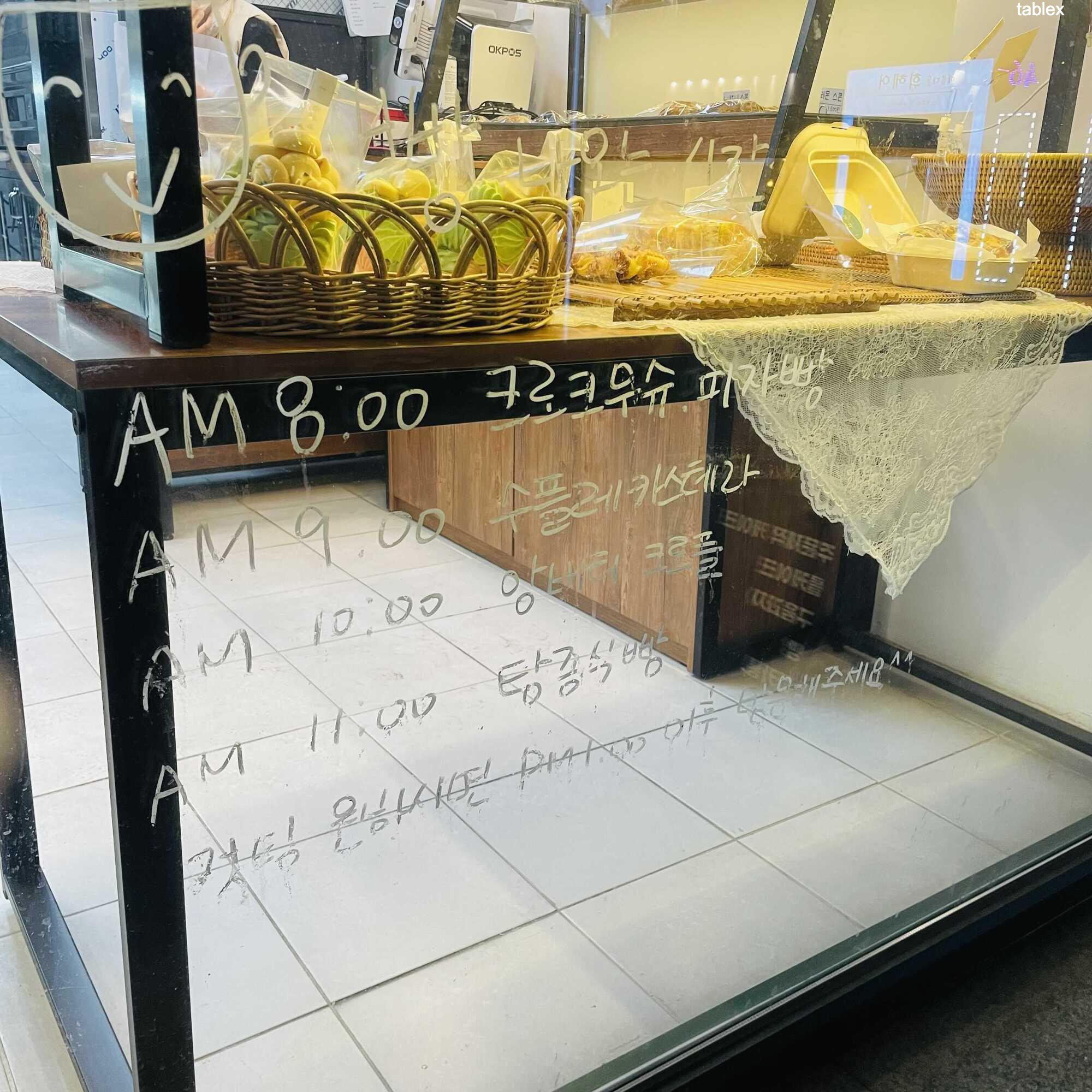 매장 유리엔 시간마다 나오는 빵 종류가 안내되어 있다.