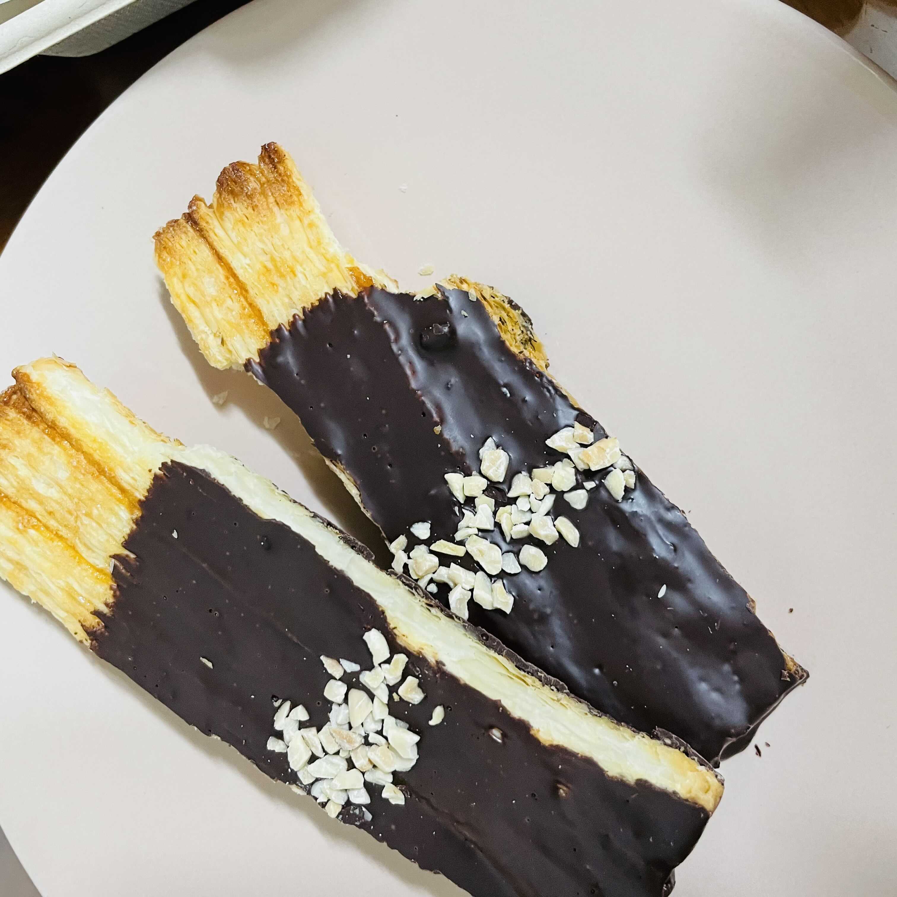 여러겹체 패스츄리를 쌓아서 굽고 거기에 초콜렛을 입힌 파이과자. 위에는 아몬드가 토핑되어 있다.