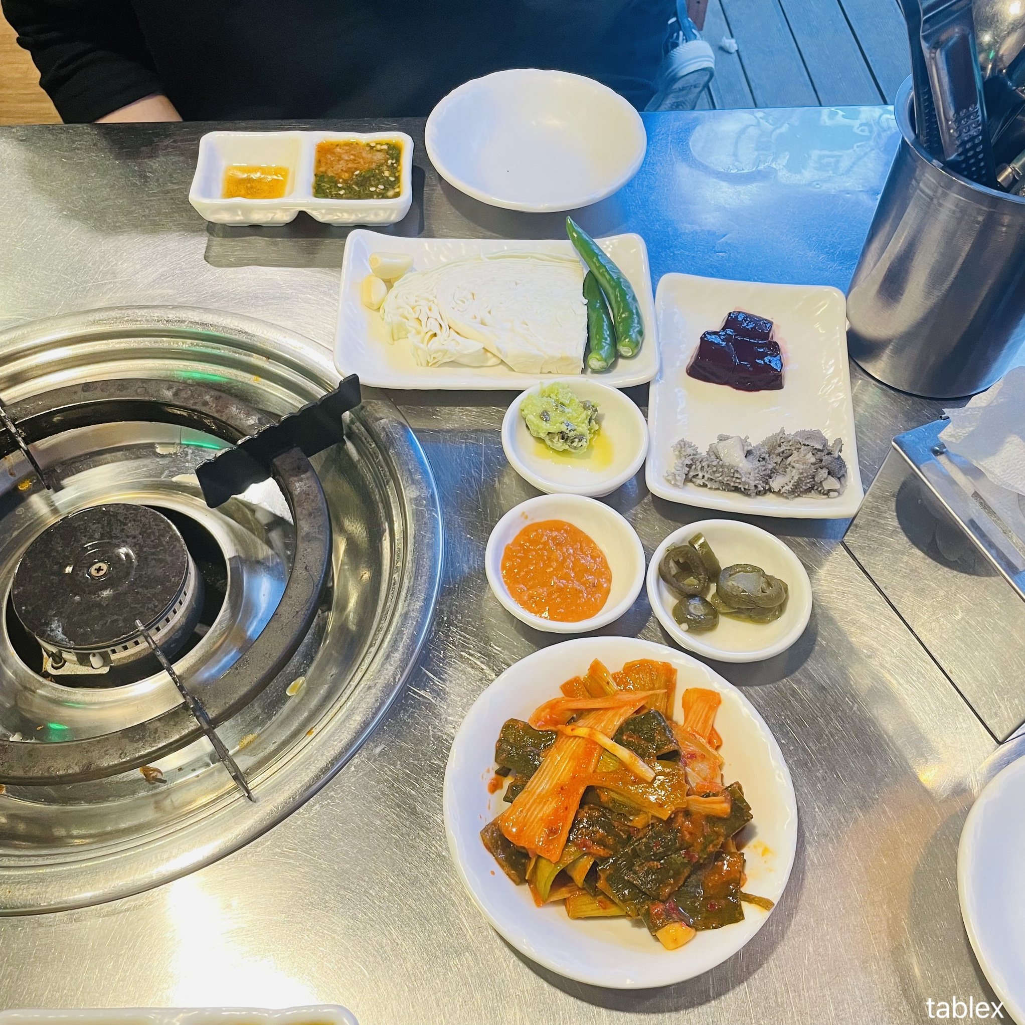 간, 천엽, 대파김치, 양배추, 고추, 마늘, 할라피뇨.